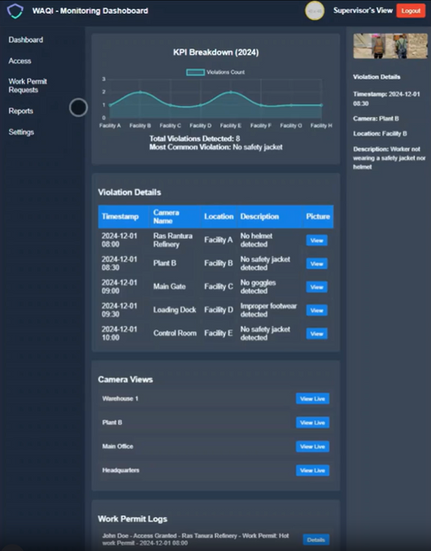 WAQI demonstrates a future where plant safety is not only monitored — but understood, referenced, and assisted by AI. With role-based interfaces, verifiable LLM responses, and high-accuracy PPE recognition, it shows how digital safety infrastructure could evolve into something proactive, transparent, and lifesaving. The homepage has navigation options for accessibility.